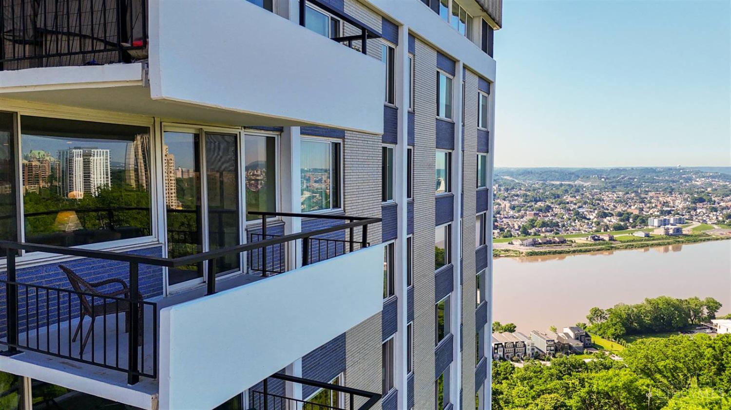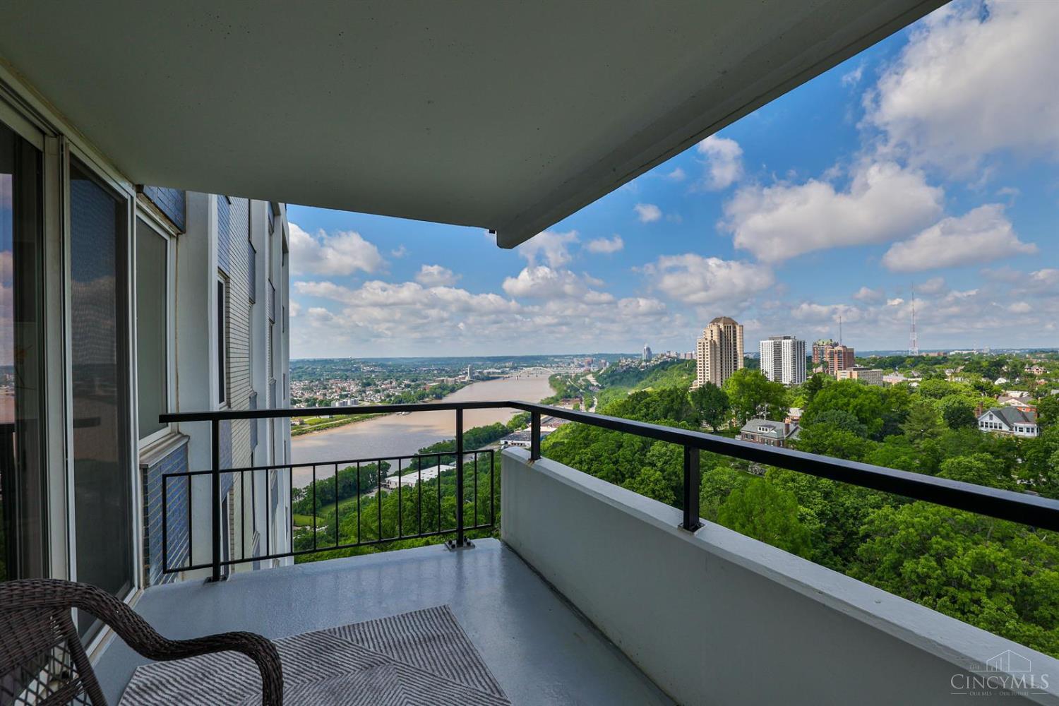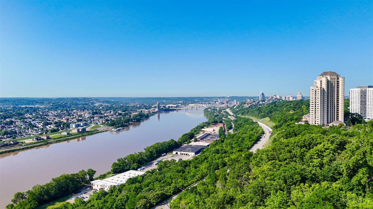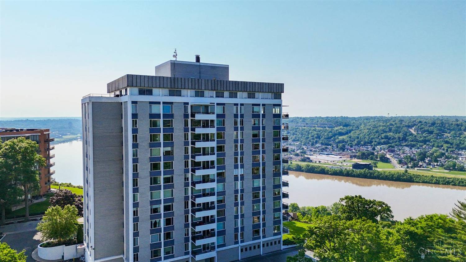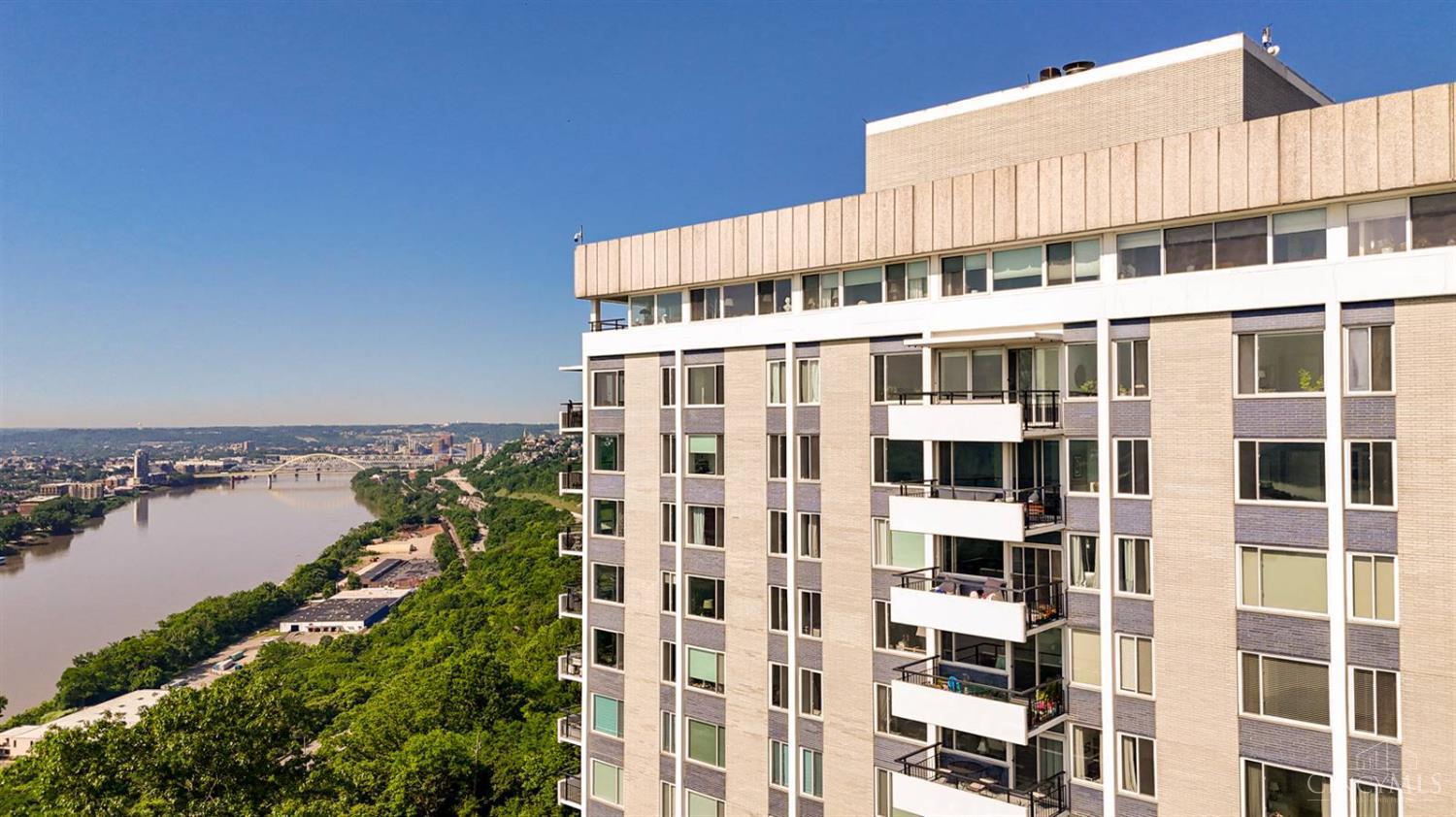 Enjoy breathtaking sunsets over the city skyline and the Ohio River from this updated 10th-floor condo in the iconic River Terrace. Full-service building with 24-hour concierge. Open-concept layout with polished concrete floors, stylish soapstone kitchen countertops, custom cabinetry, tasteful backsplash, stainless appliances, and breakfast bar. Primary suite has custom walk-in closet, second closet, built-ins, updated ensuite with large shower and dual sinks. Updated second bath, in-unit laundry. All HVAC units have been replaced within the past 3 years. Large windows and private covered balcony flood the home with natural light and offer spectacular river & city views-ideal for fireworks. Contemporary ceilings fans throughout. HOA covers 1 garage & 1 off-street parking spot, 24-hour security, valet parking, heat, A/C, water, cable, internet, fitness center, and community room. Large storage space included. 10-year CRA tax abatement in place until 2029.