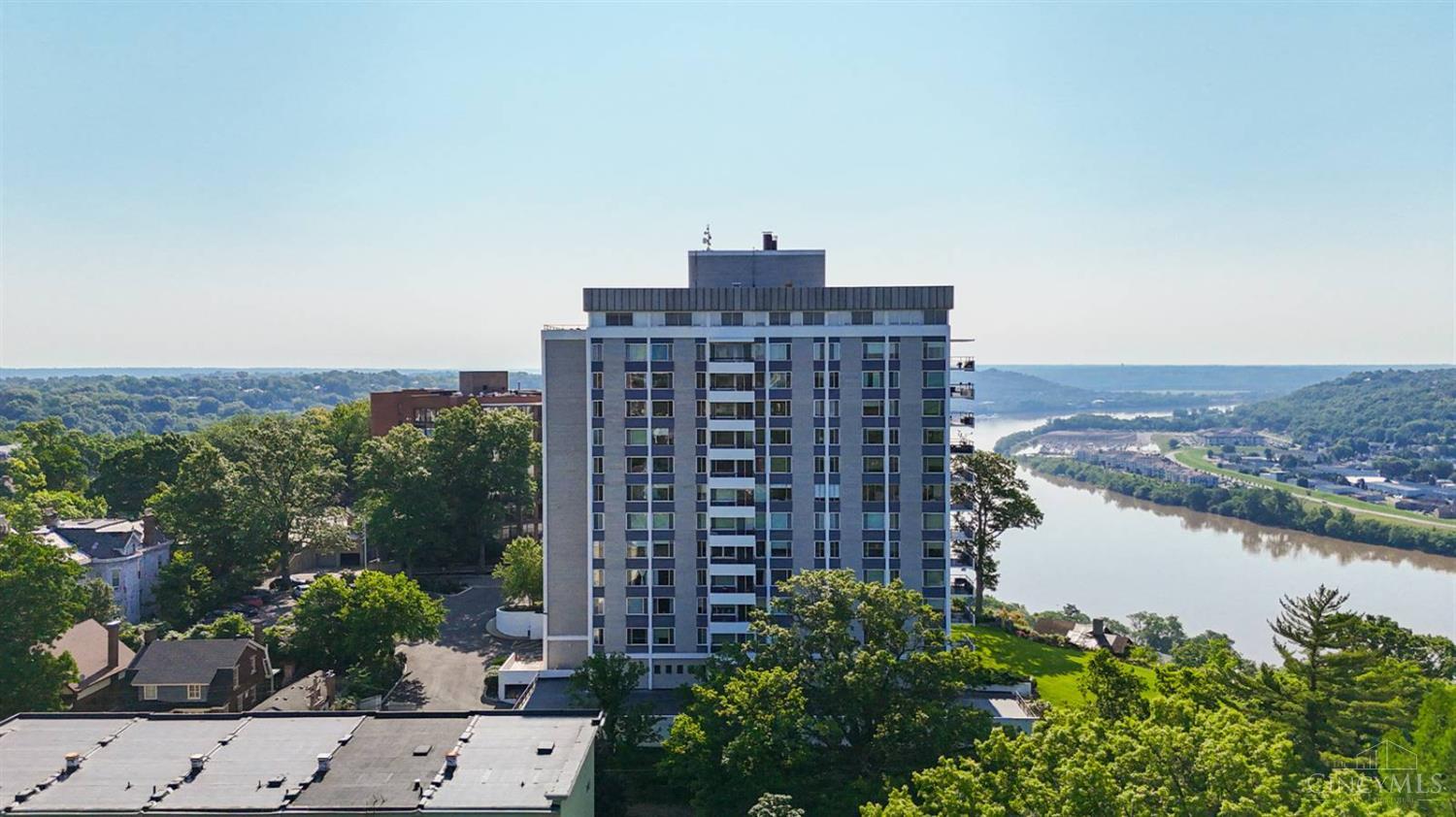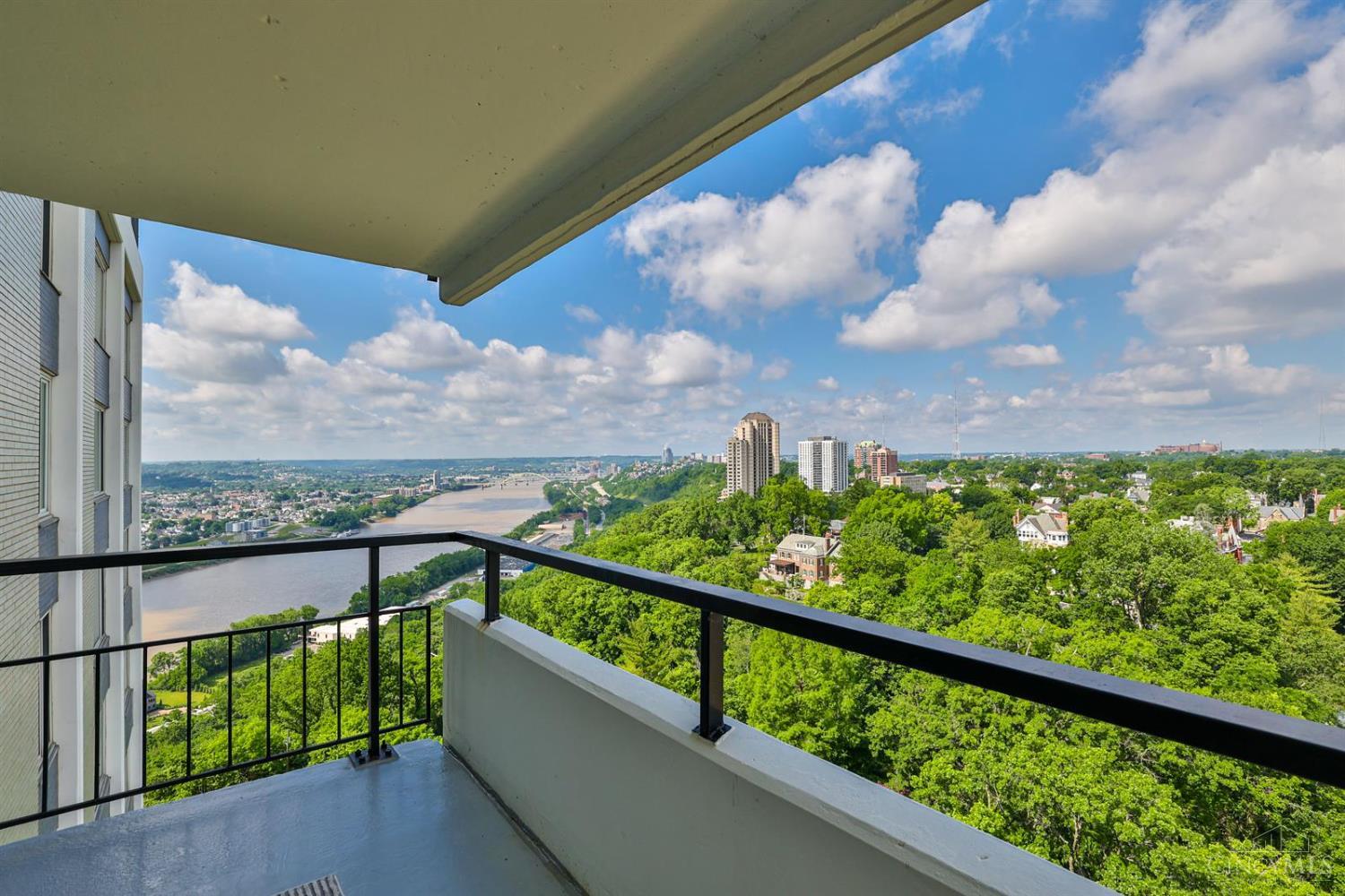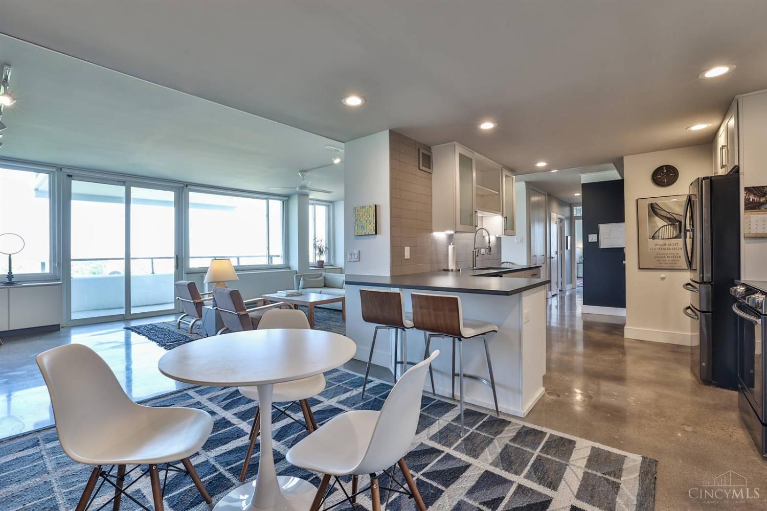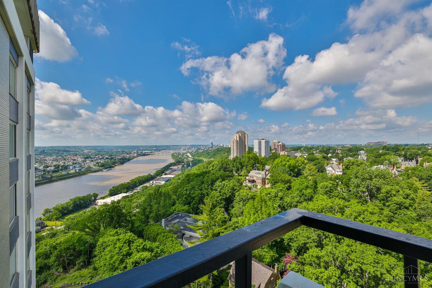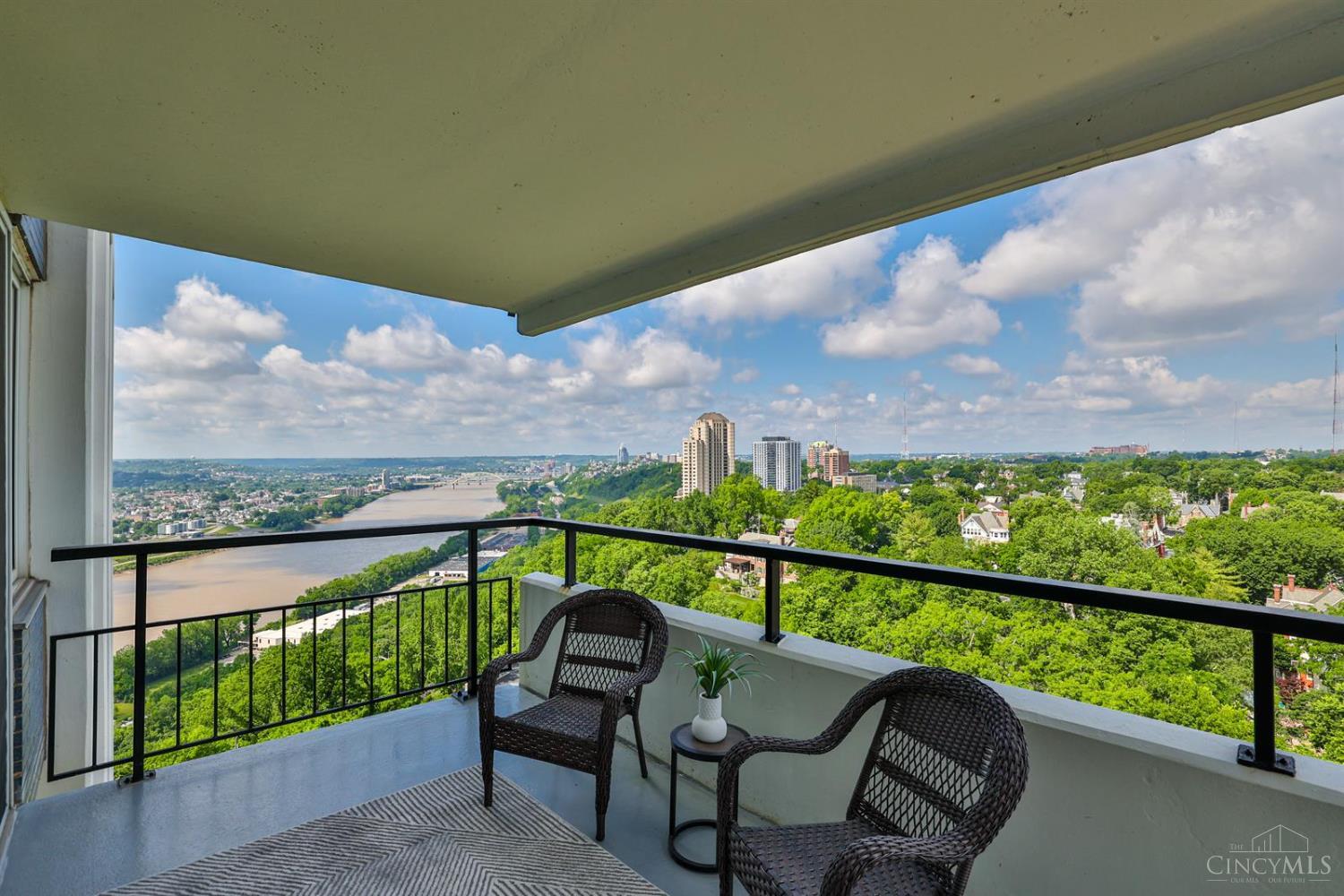 Enjoy breathtaking sunsets over the city skyline and the Ohio River from this updated 10th-floor condo in the iconic River Terrace. Full-service building with 24-hour concierge. Open-concept layout with polished concrete floors, stylish soapstone kitchen countertops, custom cabinetry, tasteful backsplash, stainless appliances, and breakfast bar. Primary suite has custom walk-in closet, second closet, built-ins, updated ensuite with large shower and dual sinks. Updated second bath, in-unit laundry. All HVAC units have been replaced within the past 3 years. Large windows and private covered balcony flood the home with natural light and offer spectacular river & city views-ideal for fireworks. Contemporary ceilings fans throughout. HOA covers 1 garage & 1 off-street parking spot, 24-hour security, valet parking, heat, A/C, water, cable, internet, fitness center, and community room. Large storage space included. 10-year CRA tax abatement in place until 2029.