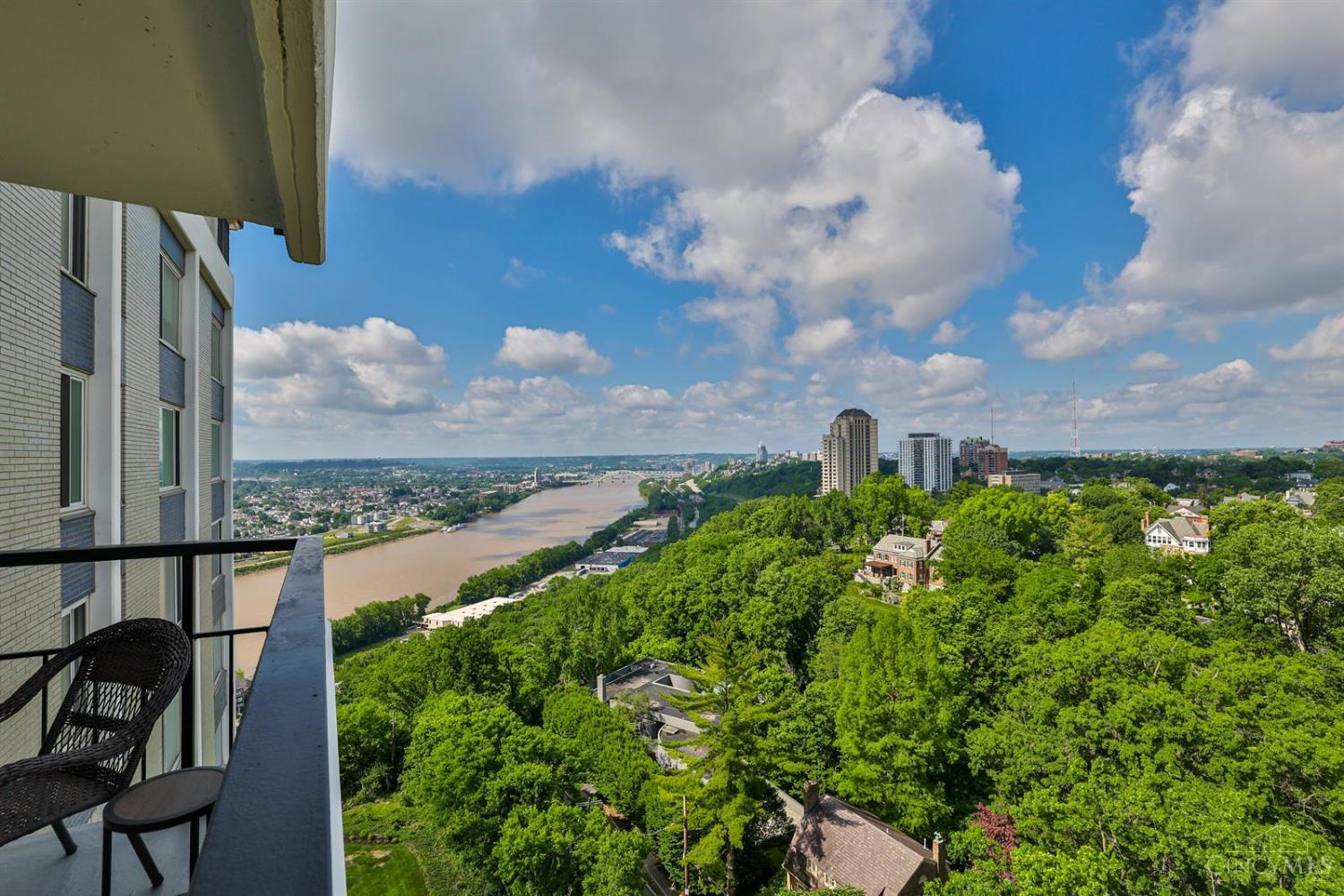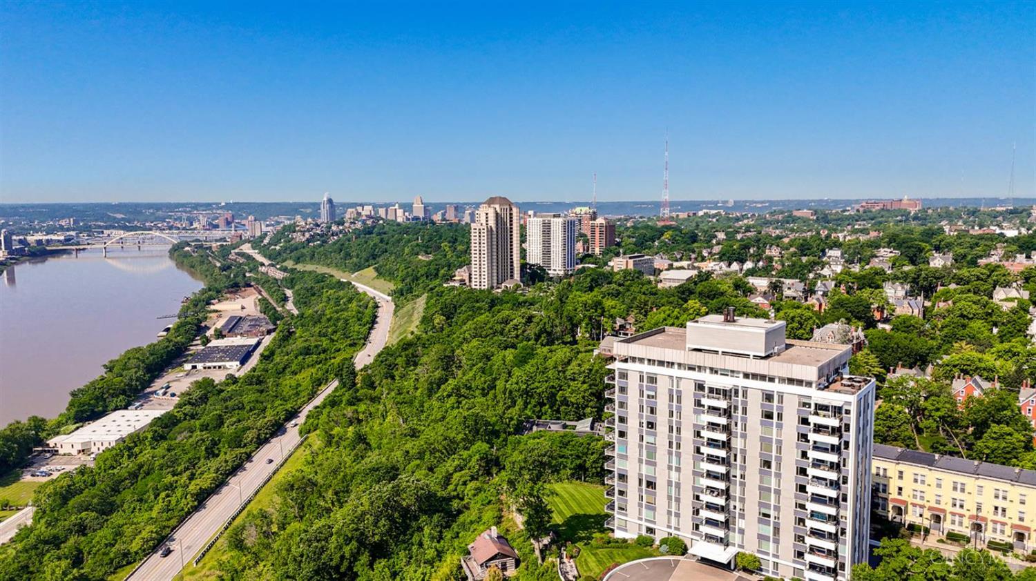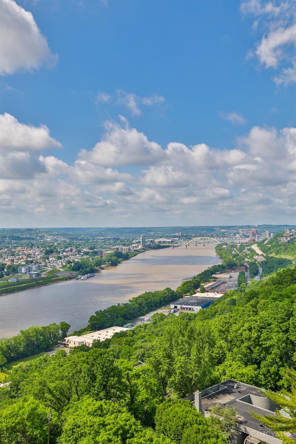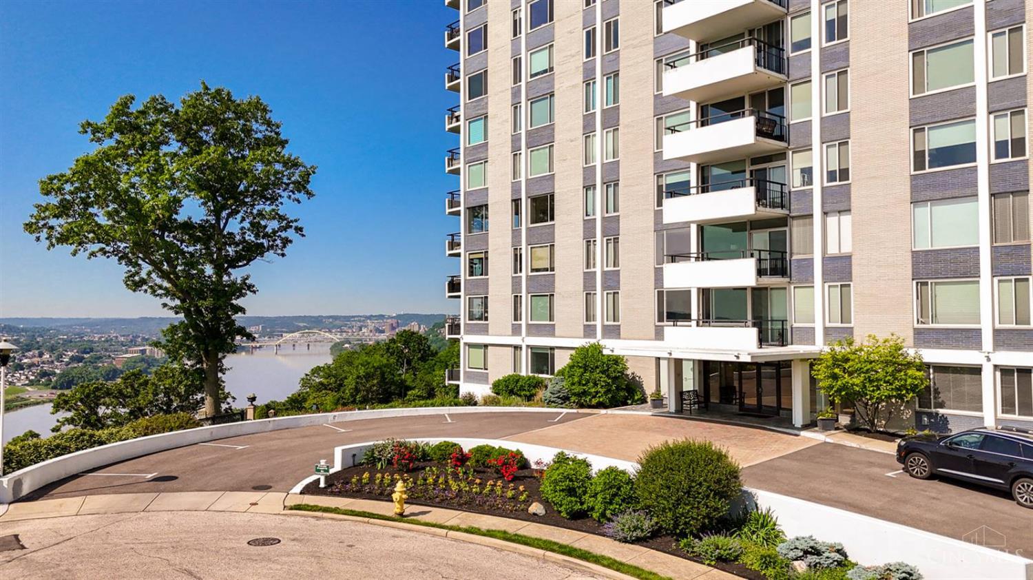 Enjoy breathtaking sunsets over the city skyline and the Ohio River from this updated 10th-floor condo in the iconic River Terrace. Full-service building with 24-hour concierge. Open-concept layout with polished concrete floors, stylish soapstone kitchen countertops, custom cabinetry, tasteful backsplash, stainless appliances, and breakfast bar. Primary suite has custom walk-in closet, second closet, built-ins, updated ensuite with large shower and dual sinks. Updated second bath, in-unit laundry. All HVAC units have been replaced within the past 3 years. Large windows and private covered balcony flood the home with natural light and offer spectacular river & city views-ideal for fireworks. Contemporary ceilings fans throughout. HOA covers 1 garage & 1 off-street parking spot, 24-hour security, valet parking, heat, A/C, water, cable, internet, fitness center, and community room. Large storage space included. 10-year CRA tax abatement in place until 2029.