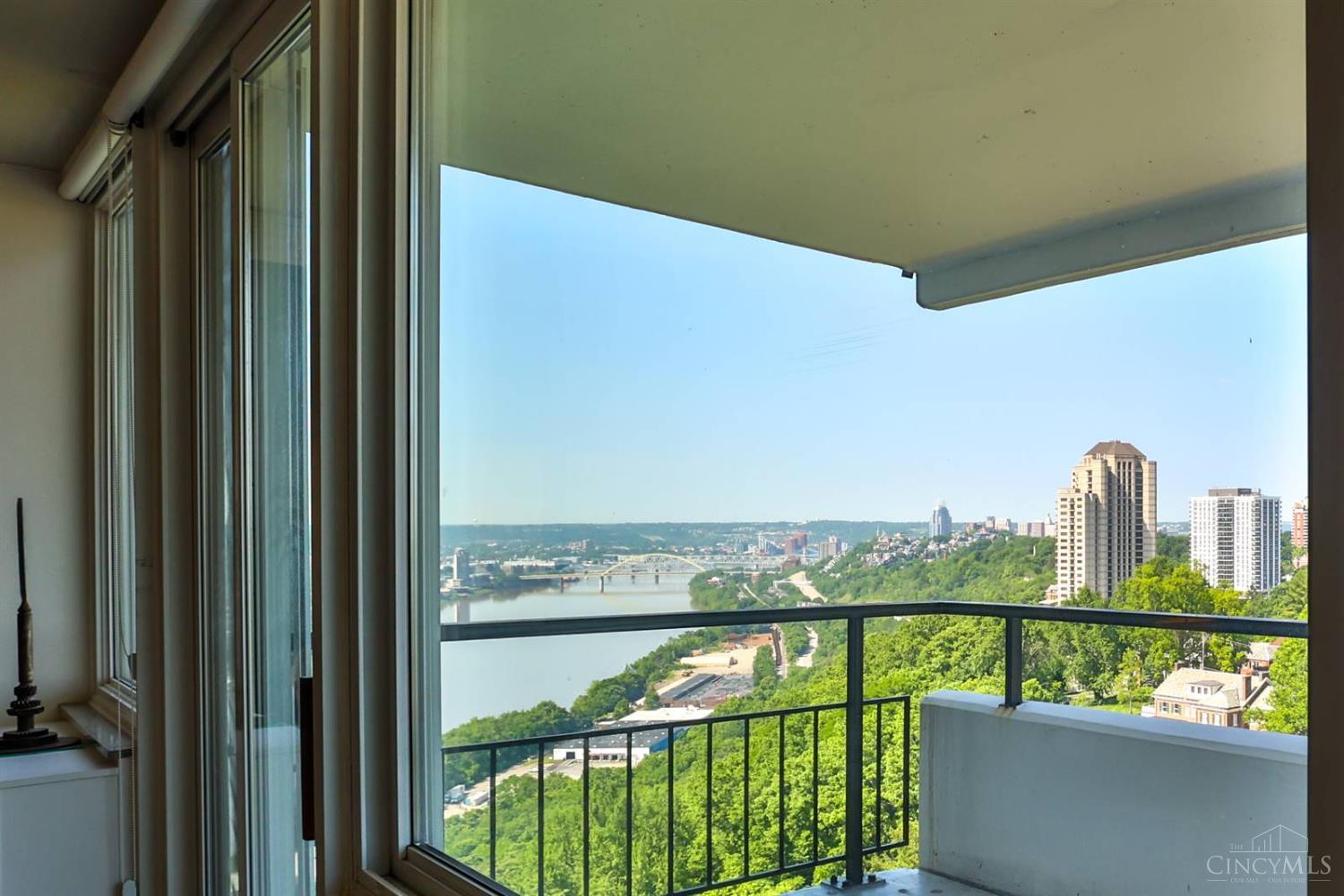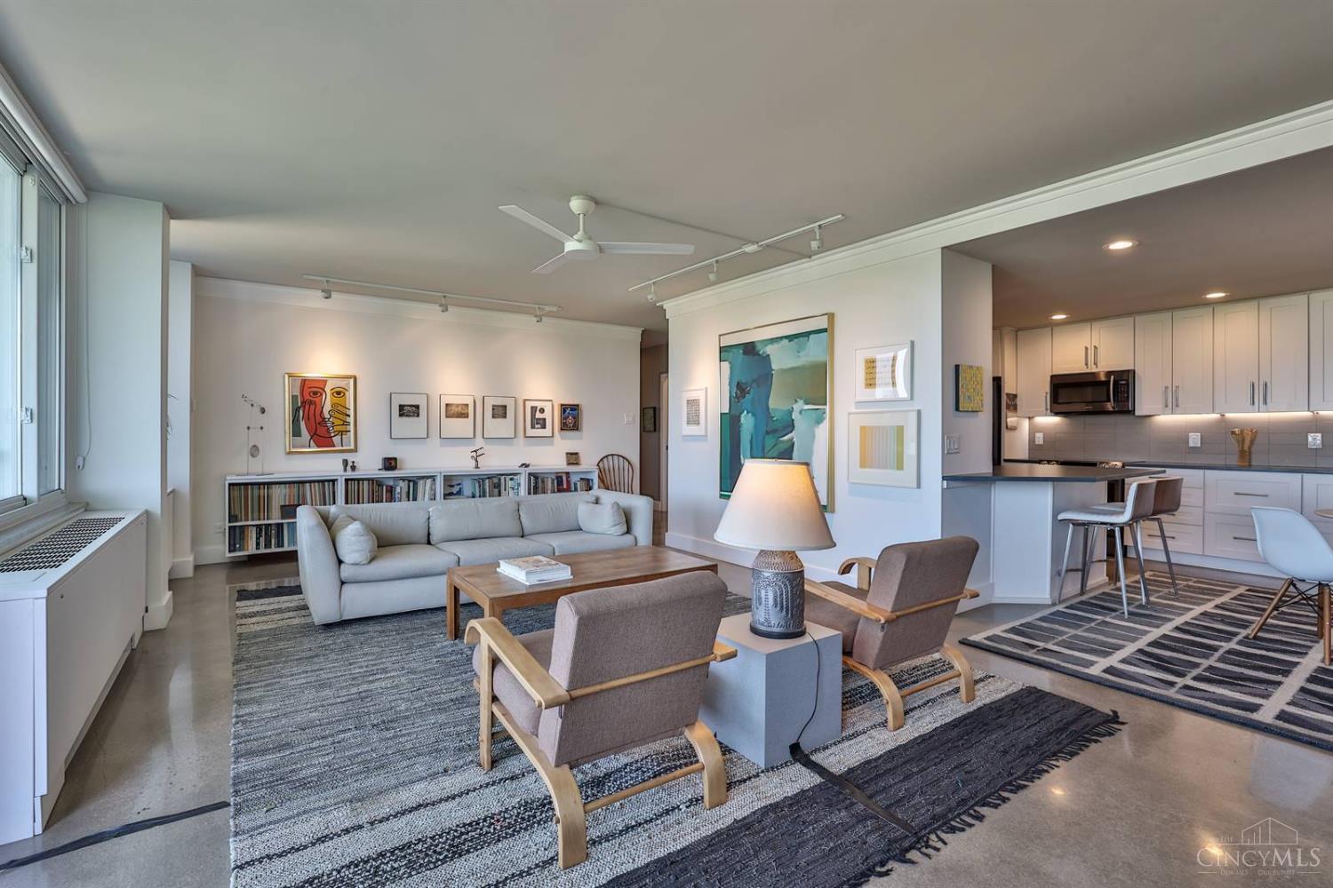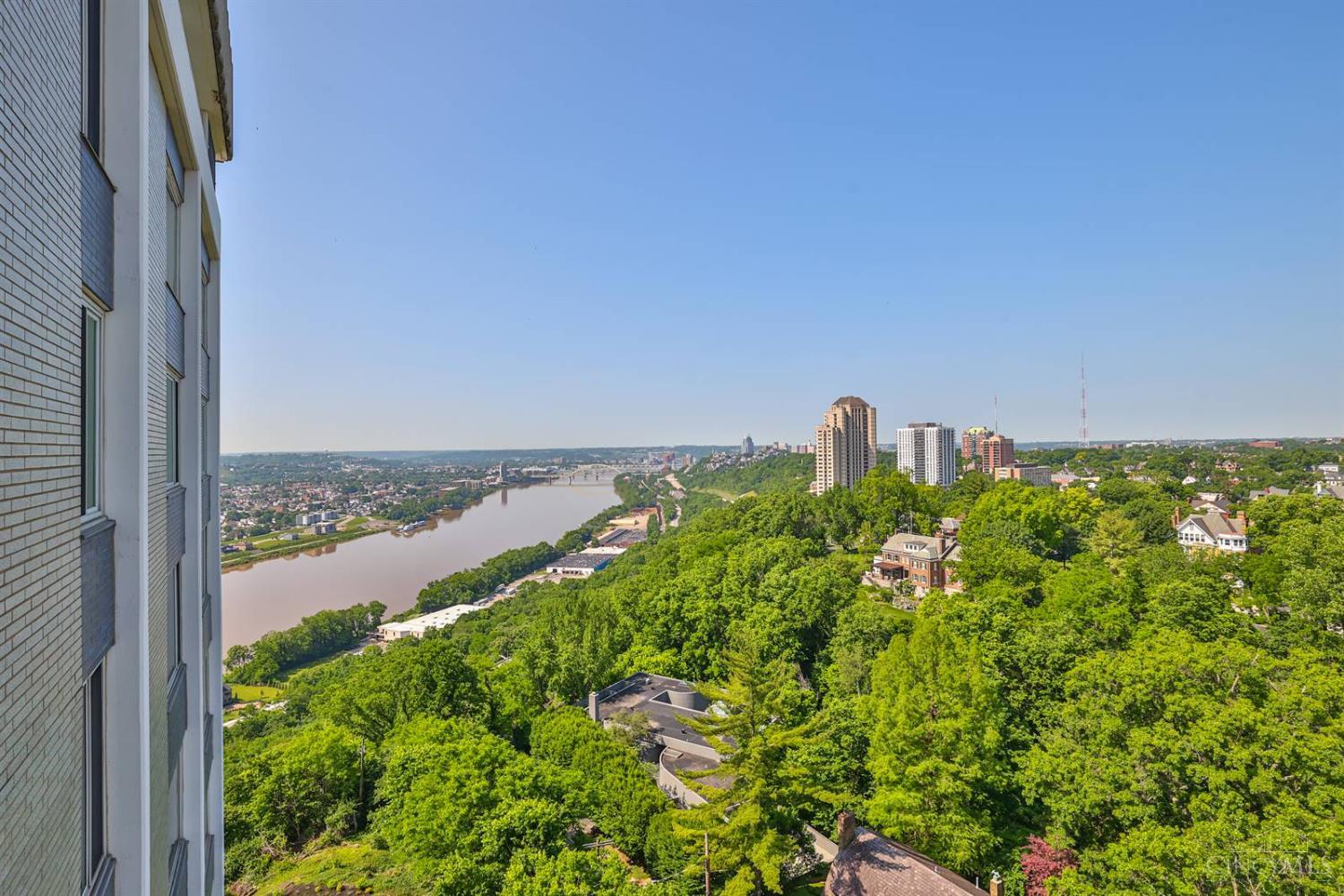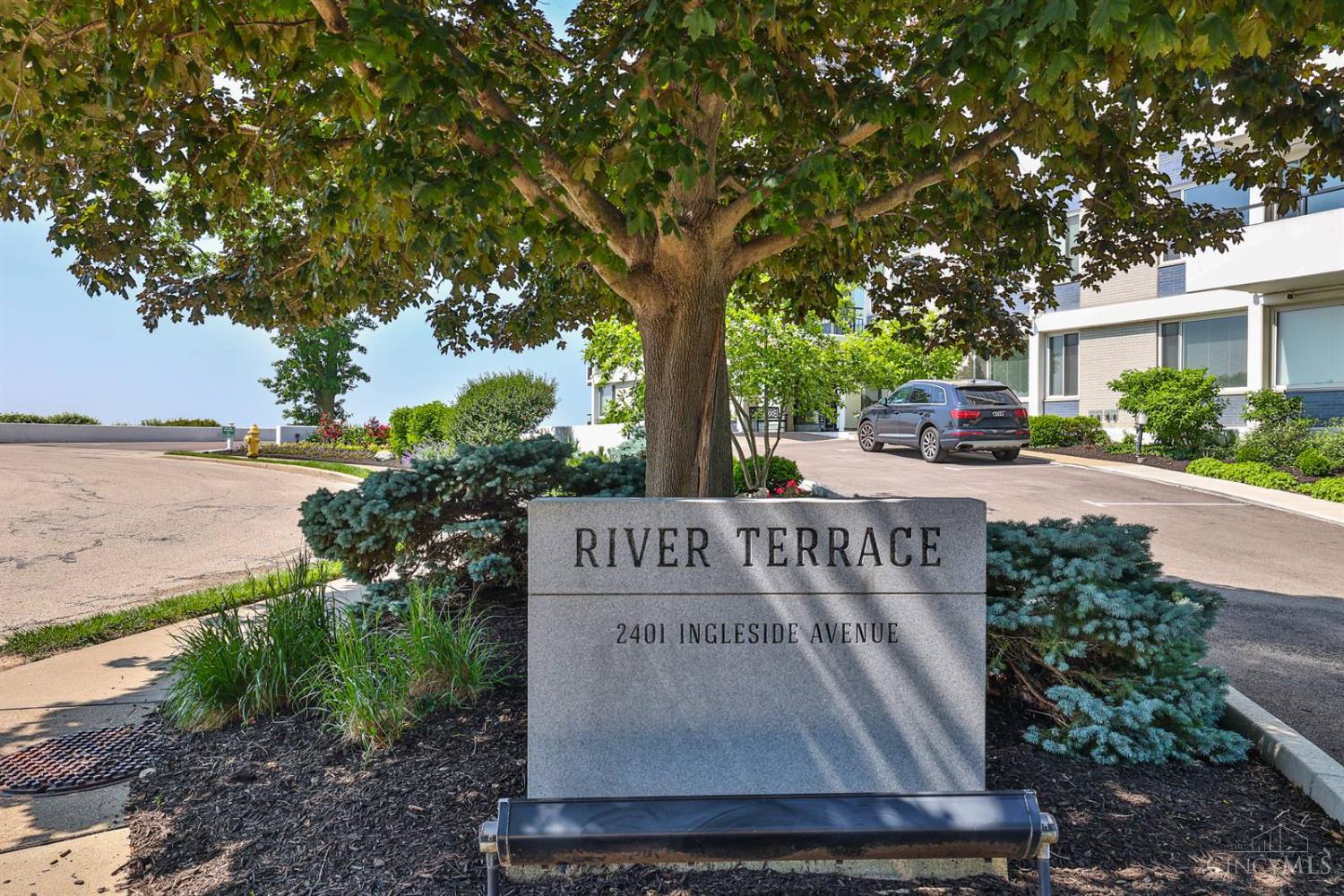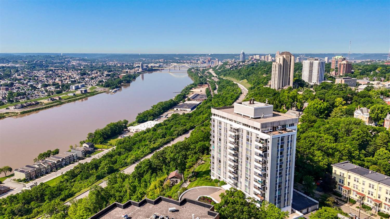 Enjoy breathtaking sunsets over the city skyline and the Ohio River from this updated 10th-floor condo in the iconic River Terrace. Full-service building with 24-hour concierge. Open-concept layout with polished concrete floors, stylish soapstone kitchen countertops, custom cabinetry, tasteful backsplash, stainless appliances, and breakfast bar. Primary suite has custom walk-in closet, second closet, built-ins, updated ensuite with large shower and dual sinks. Updated second bath, in-unit laundry. All HVAC units have been replaced within the past 3 years. Large windows and private covered balcony flood the home with natural light and offer spectacular river & city views-ideal for fireworks. Contemporary ceilings fans throughout. HOA covers 1 garage & 1 off-street parking spot, 24-hour security, valet parking, heat, A/C, water, cable, internet, fitness center, and community room. Large storage space included. 10-year CRA tax abatement in place until 2029.