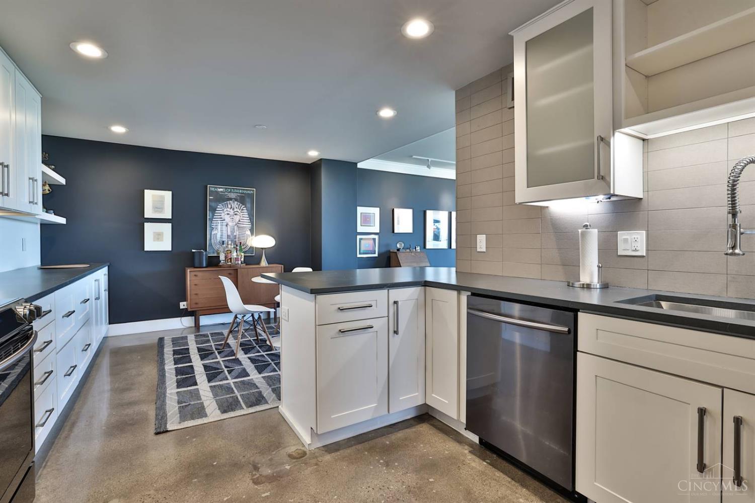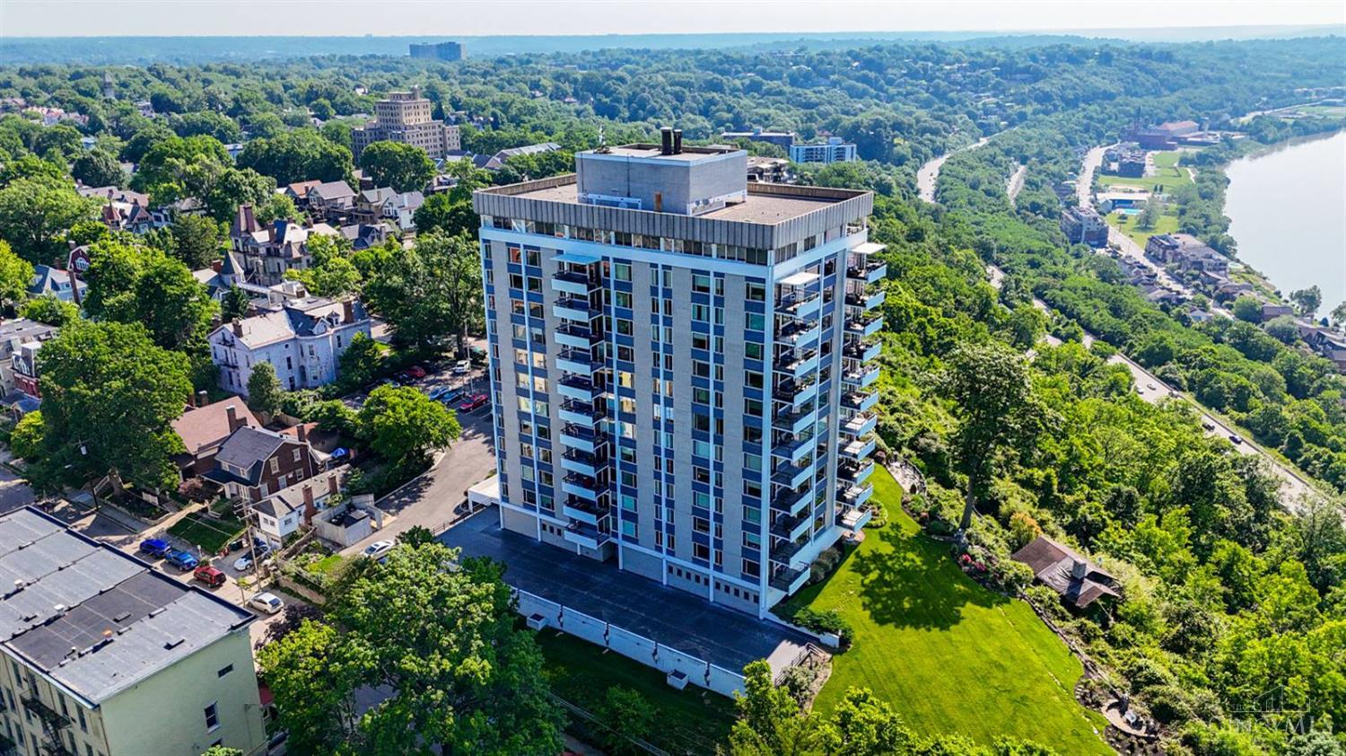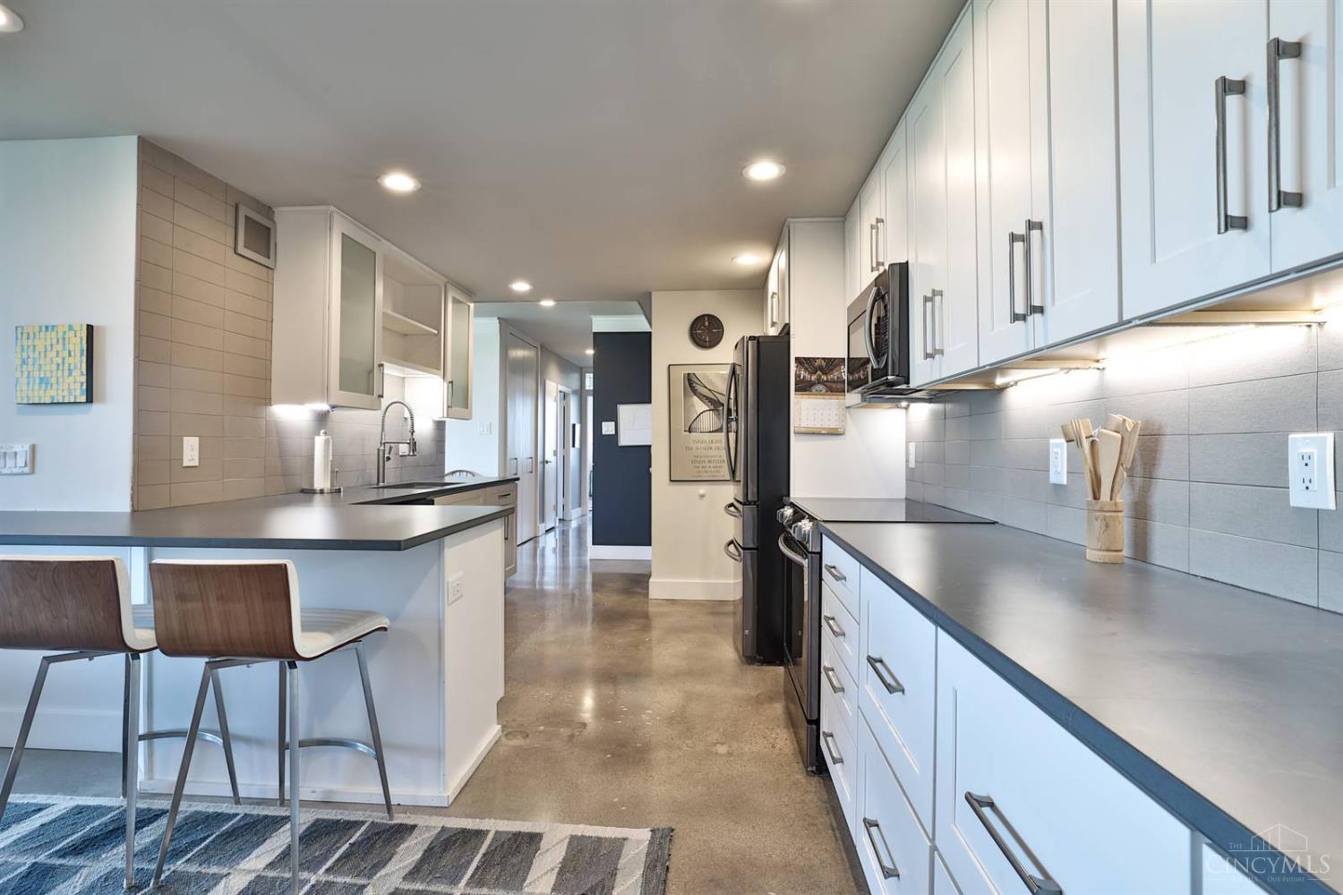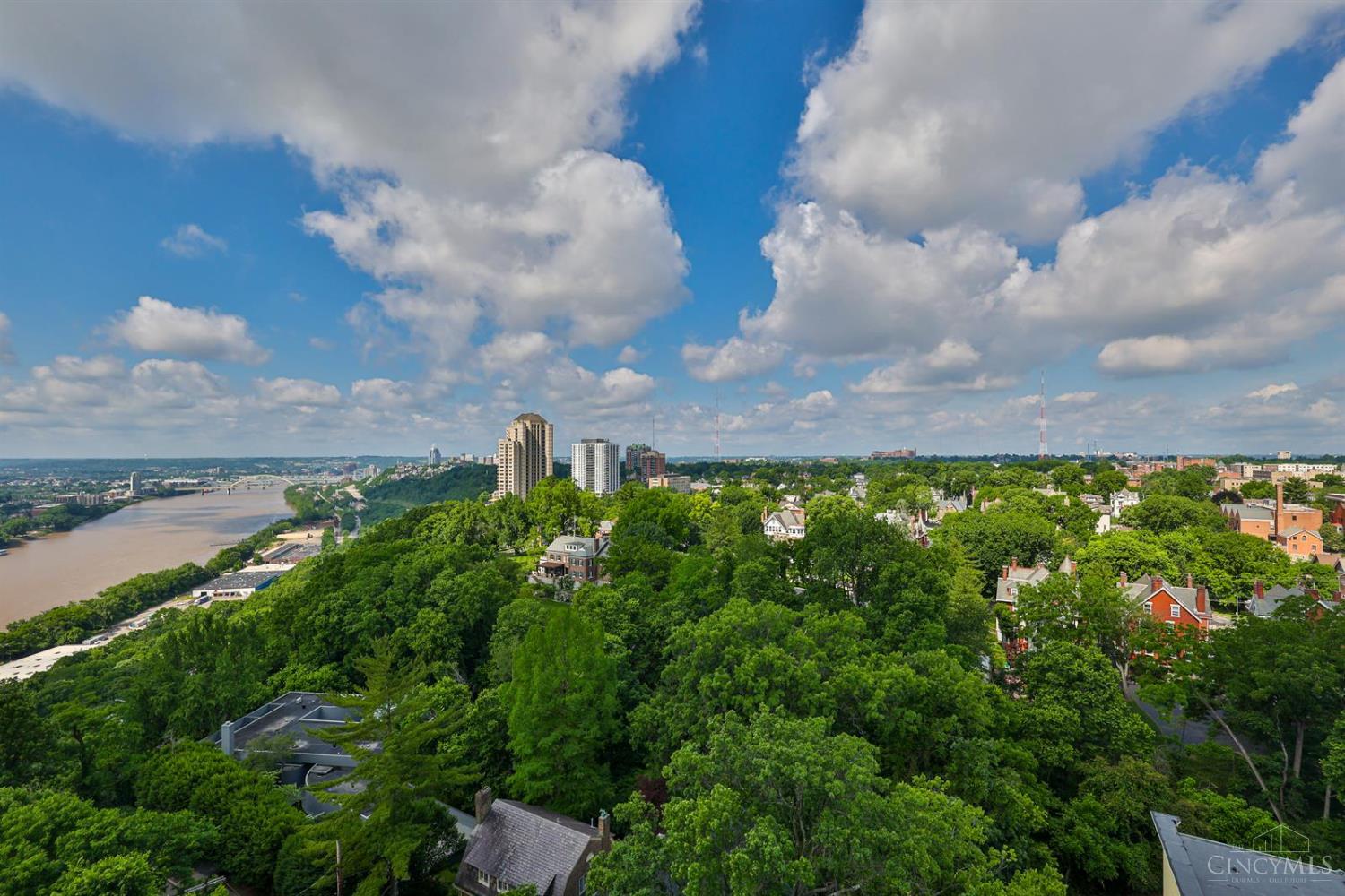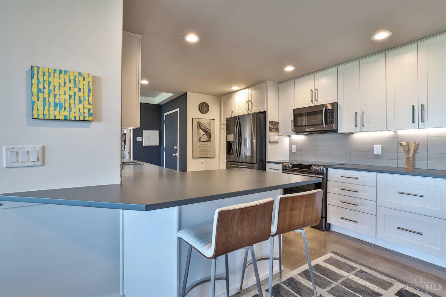 Enjoy breathtaking sunsets over the city skyline and the Ohio River from this updated 10th-floor condo in the iconic River Terrace. Full-service building with 24-hour concierge. Open-concept layout with polished concrete floors, stylish soapstone kitchen countertops, custom cabinetry, tasteful backsplash, stainless appliances, and breakfast bar. Primary suite has custom walk-in closet, second closet, built-ins, updated ensuite with large shower and dual sinks. Updated second bath, in-unit laundry. All HVAC units have been replaced within the past 3 years. Large windows and private covered balcony flood the home with natural light and offer spectacular river & city views-ideal for fireworks. Contemporary ceilings fans throughout. HOA covers 1 garage & 1 off-street parking spot, 24-hour security, valet parking, heat, A/C, water, cable, internet, fitness center, and community room. Large storage space included. 10-year CRA tax abatement in place until 2029.