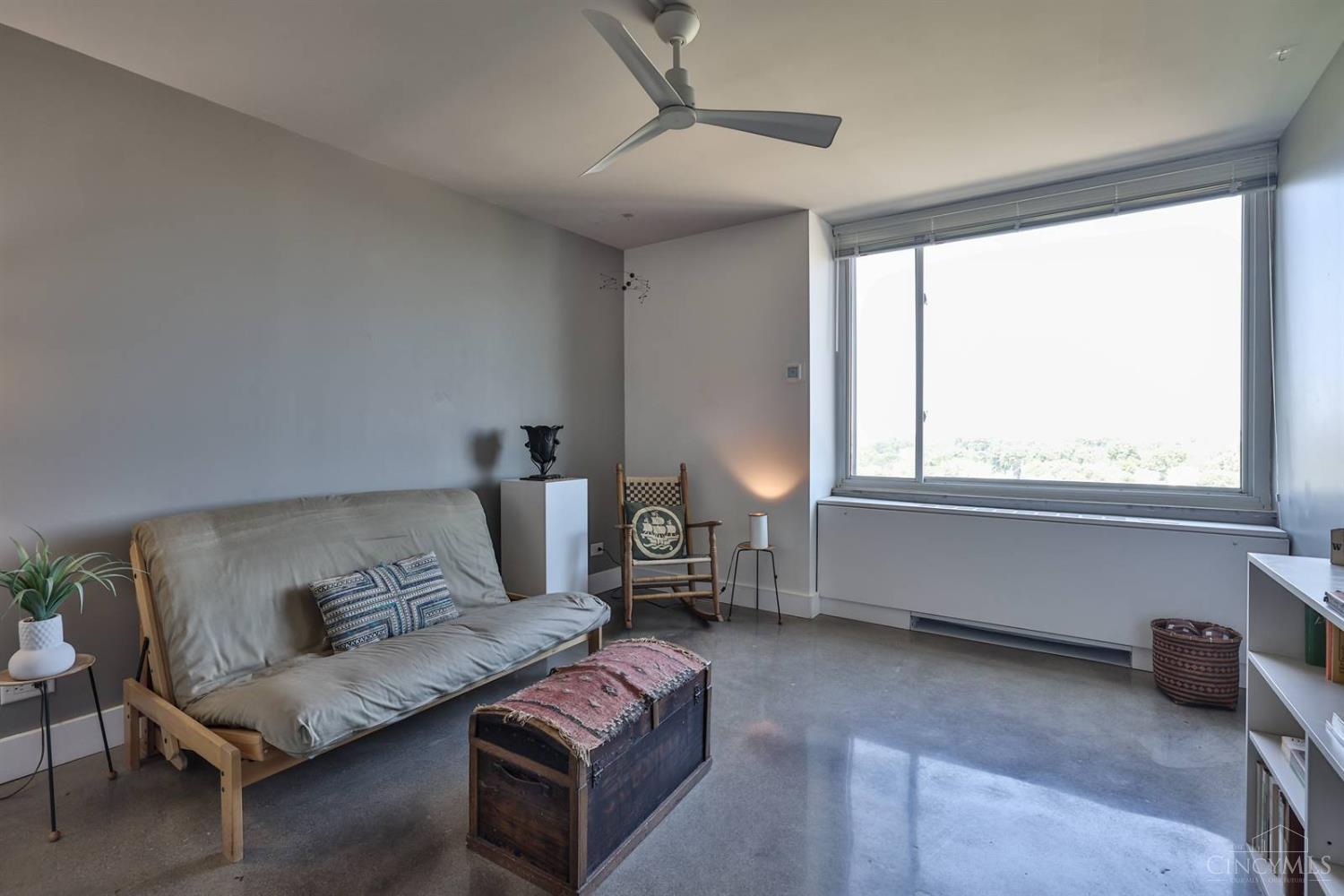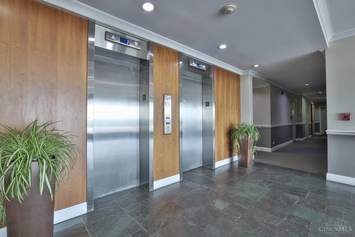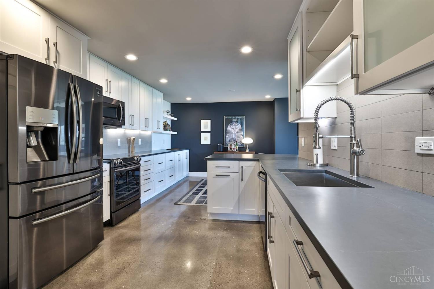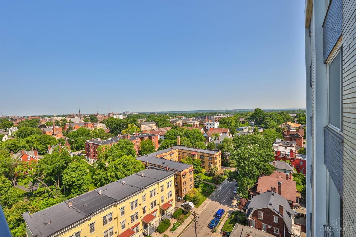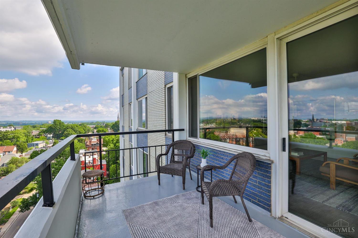 Enjoy breathtaking sunsets over the city skyline and the Ohio River from this updated 10th-floor condo in the iconic River Terrace. Full-service building with 24-hour concierge. Open-concept layout with polished concrete floors, stylish soapstone kitchen countertops, custom cabinetry, tasteful backsplash, stainless appliances, and breakfast bar. Primary suite has custom walk-in closet, second closet, built-ins, updated ensuite with large shower and dual sinks. Updated second bath, in-unit laundry. All HVAC units have been replaced within the past 3 years. Large windows and private covered balcony flood the home with natural light and offer spectacular river & city views-ideal for fireworks. Contemporary ceilings fans throughout. HOA covers 1 garage & 1 off-street parking spot, 24-hour security, valet parking, heat, A/C, water, cable, internet, fitness center, and community room. Large storage space included. 10-year CRA tax abatement in place until 2029.