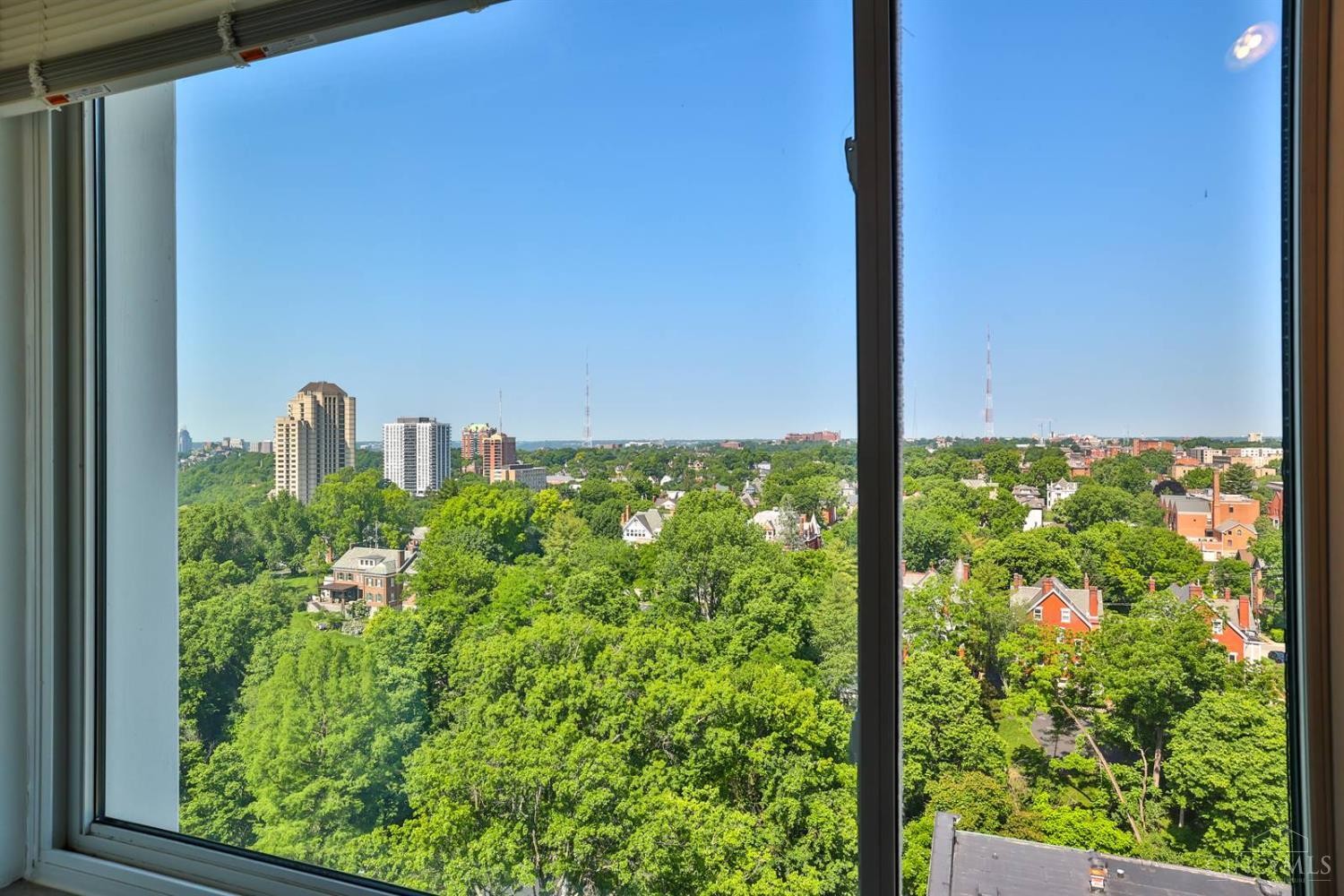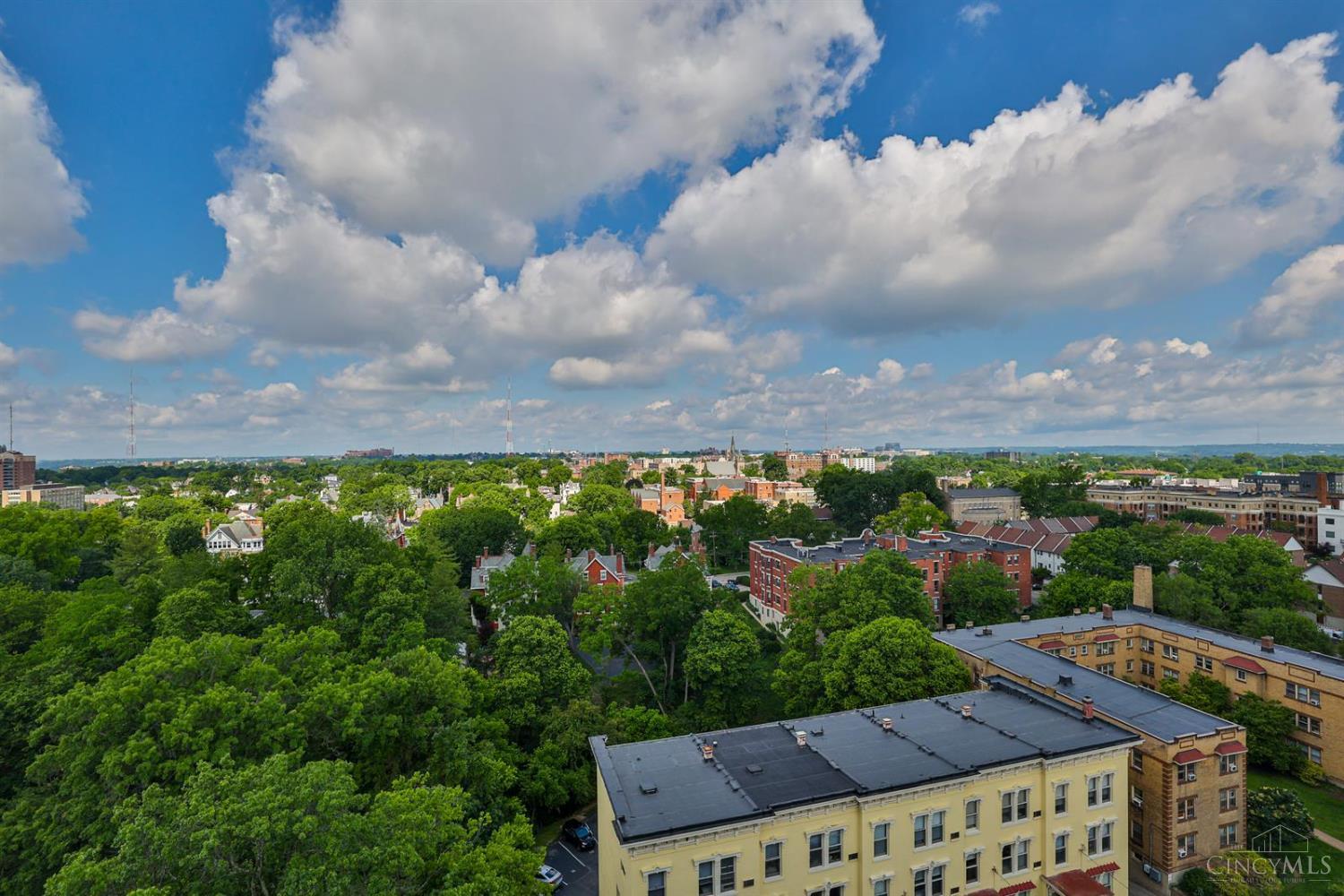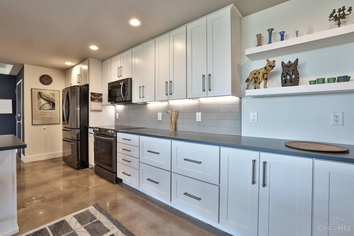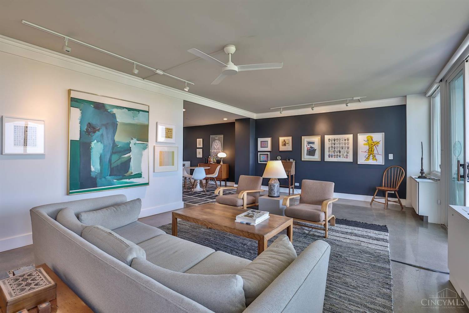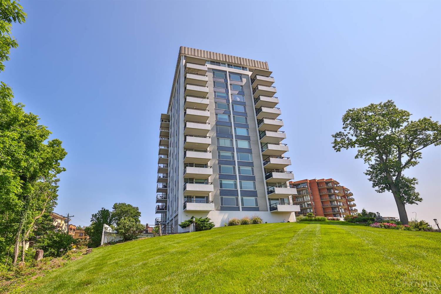 Enjoy breathtaking sunsets over the city skyline and the Ohio River from this updated 10th-floor condo in the iconic River Terrace. Full-service building with 24-hour concierge. Open-concept layout with polished concrete floors, stylish soapstone kitchen countertops, custom cabinetry, tasteful backsplash, stainless appliances, and breakfast bar. Primary suite has custom walk-in closet, second closet, built-ins, updated ensuite with large shower and dual sinks. Updated second bath, in-unit laundry. All HVAC units have been replaced within the past 3 years. Large windows and private covered balcony flood the home with natural light and offer spectacular river & city views-ideal for fireworks. Contemporary ceilings fans throughout. HOA covers 1 garage & 1 off-street parking spot, 24-hour security, valet parking, heat, A/C, water, cable, internet, fitness center, and community room. Large storage space included. 10-year CRA tax abatement in place until 2029.