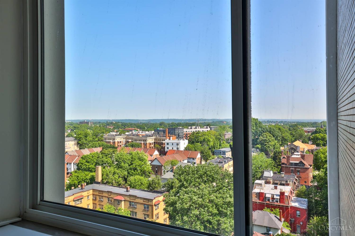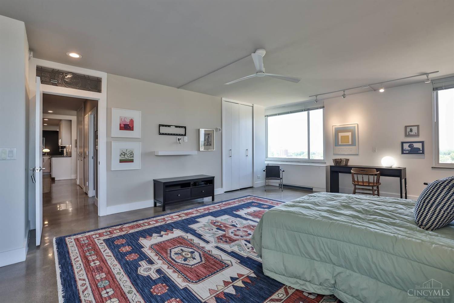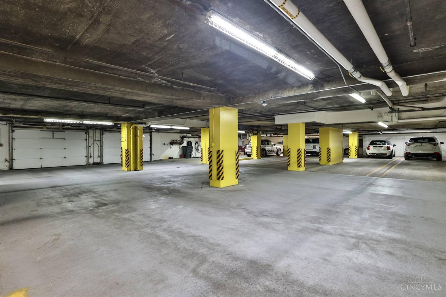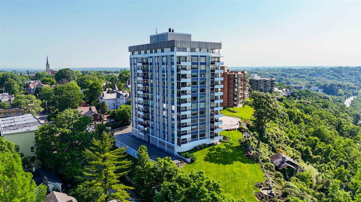 Enjoy breathtaking sunsets over the city skyline and the Ohio River from this updated 10th-floor condo in the iconic River Terrace. Full-service building with 24-hour concierge. Open-concept layout with polished concrete floors, stylish soapstone kitchen countertops, custom cabinetry, tasteful backsplash, stainless appliances, and breakfast bar. Primary suite has custom walk-in closet, second closet, built-ins, updated ensuite with large shower and dual sinks. Updated second bath, in-unit laundry. All HVAC units have been replaced within the past 3 years. Large windows and private covered balcony flood the home with natural light and offer spectacular river & city views-ideal for fireworks. Contemporary ceilings fans throughout. HOA covers 1 garage & 1 off-street parking spot, 24-hour security, valet parking, heat, A/C, water, cable, internet, fitness center, and community room. Large storage space included. 10-year CRA tax abatement in place until 2029.