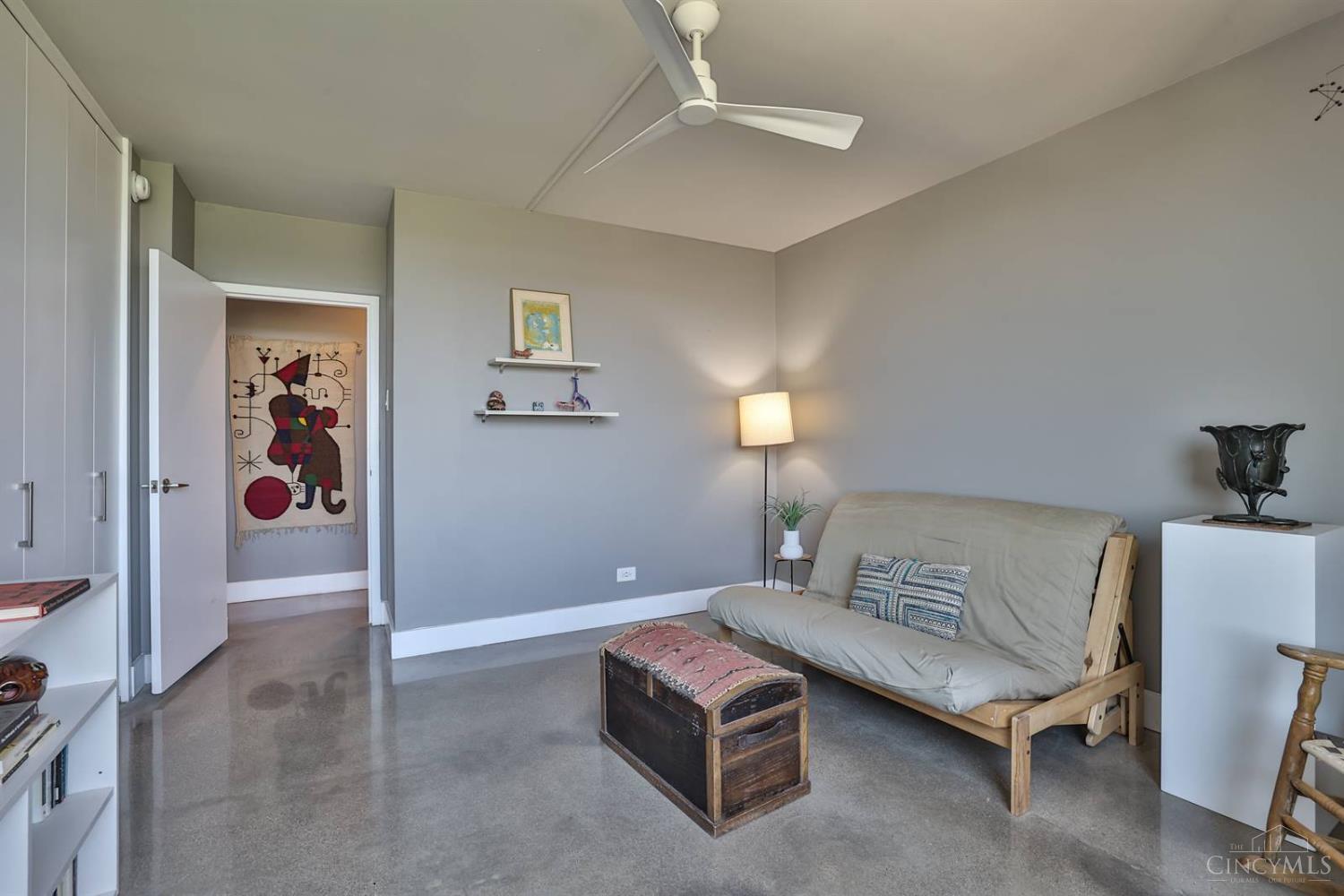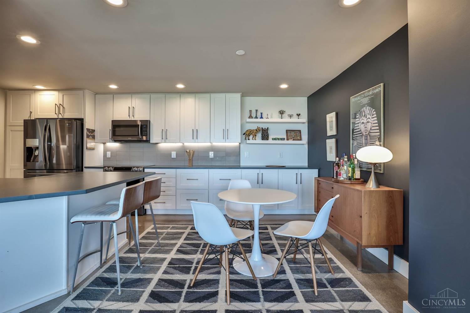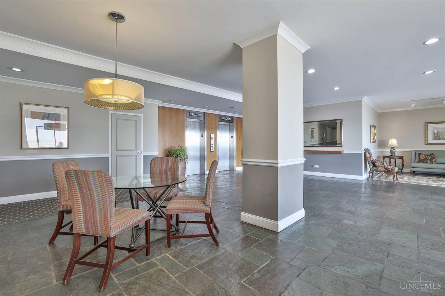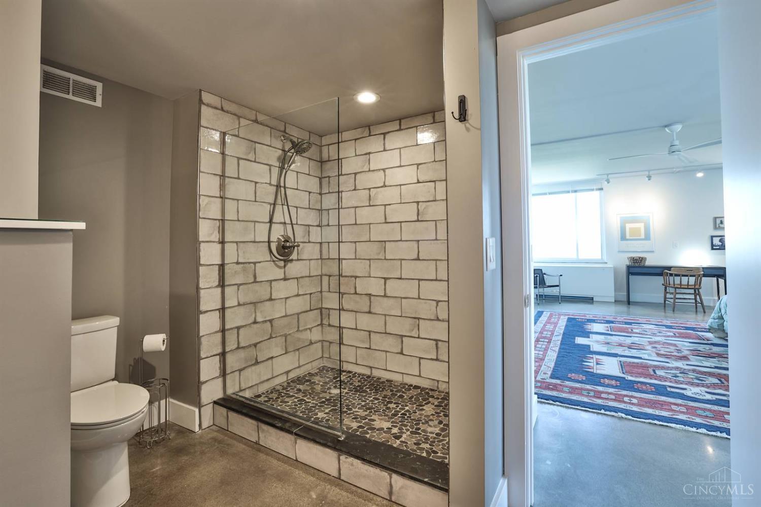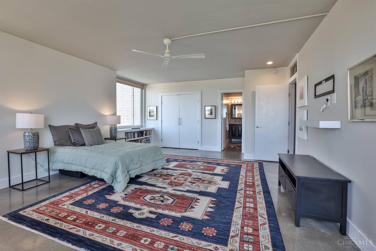 Enjoy breathtaking sunsets over the city skyline and the Ohio River from this updated 10th-floor condo in the iconic River Terrace. Full-service building with 24-hour concierge. Open-concept layout with polished concrete floors, stylish soapstone kitchen countertops, custom cabinetry, tasteful backsplash, stainless appliances, and breakfast bar. Primary suite has custom walk-in closet, second closet, built-ins, updated ensuite with large shower and dual sinks. Updated second bath, in-unit laundry. All HVAC units have been replaced within the past 3 years. Large windows and private covered balcony flood the home with natural light and offer spectacular river & city views-ideal for fireworks. Contemporary ceilings fans throughout. HOA covers 1 garage & 1 off-street parking spot, 24-hour security, valet parking, heat, A/C, water, cable, internet, fitness center, and community room. Large storage space included. 10-year CRA tax abatement in place until 2029.
